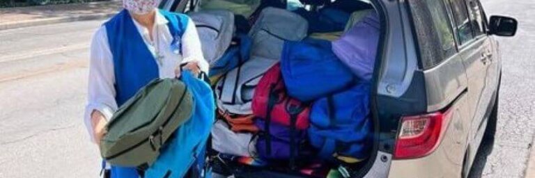Sister Mercedes brought IWC about 100 backpacks one morning. Each one has a blanket, a bag of toiletries, and a…
