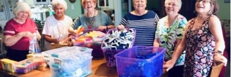Nancy Coffer, Bonnie and Michael Langford, and Judy and Jim Ritchie prepare backpacks for immigrants at the airport. Twice…
