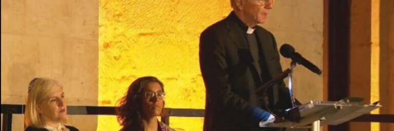 Archbishop Gustave Garcia-Siller addresses the crowd as Rabbi Mara Nathan and Pastor Dianna Garcia look on. INTERFAITH PRAYER VIGIL In…