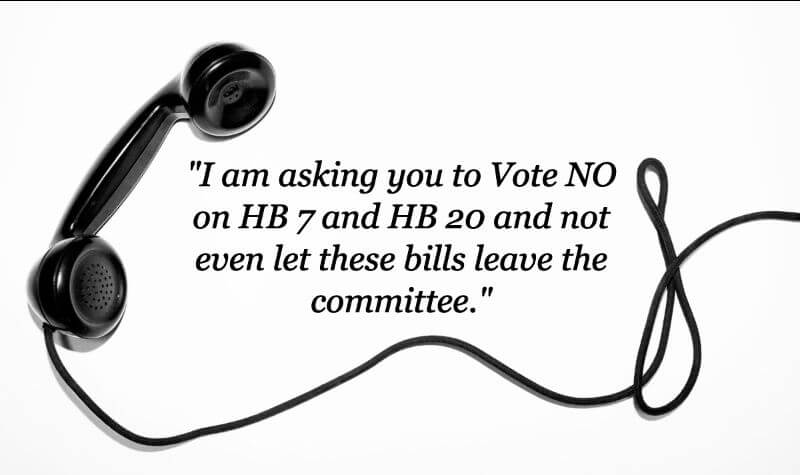 - “I’m calling because you’re on the House State Affairs Committee, and HB 7 and HB 20 will soon be on the agenda. I am asking you to Vote No and not even let these bills leave the committee.”