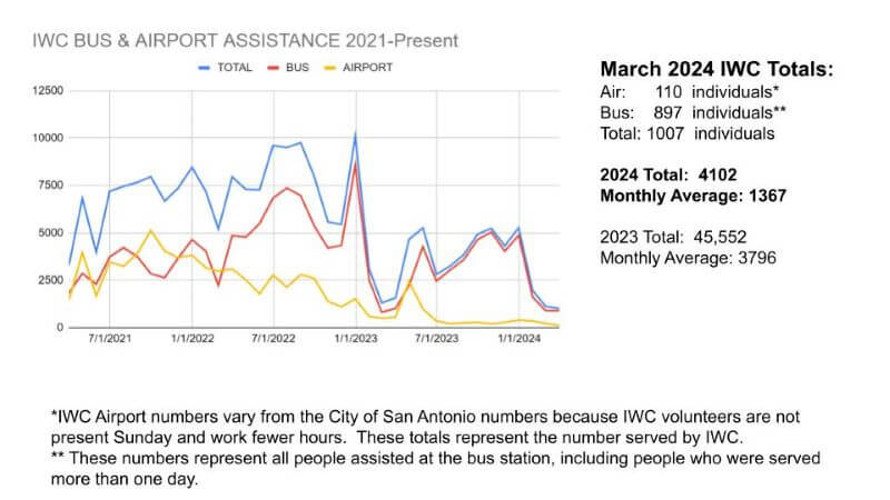 The IWC served 4,102 people between January and March 2024. The 2024 monthly average is 1,367. In March 2024 alone, the IWC served 1,007 individuals at the bus station and airport. The vast majority were assisted at the bus station.