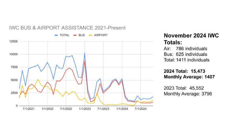The IWC served 15,473 people between January and October 2024. The 2024 monthly average is 1,407. In November 2024 alone, the IWC served 1,411 individuals at the bus station and airport – 625 at the bus station and 786 at the airport.