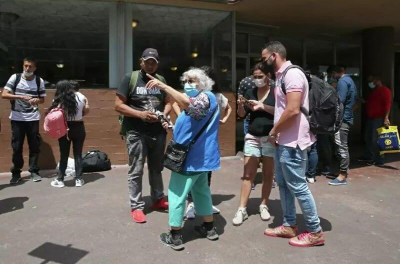 Volunteers with the Interfaith Welcome Coalition help migrants released from immigration detention and dropped off at the Greyhound Bus station in downtown San Antonio, Friday, April 22, 2022. (Photo Credit: Jerry Lara/San Antonio Express-News)