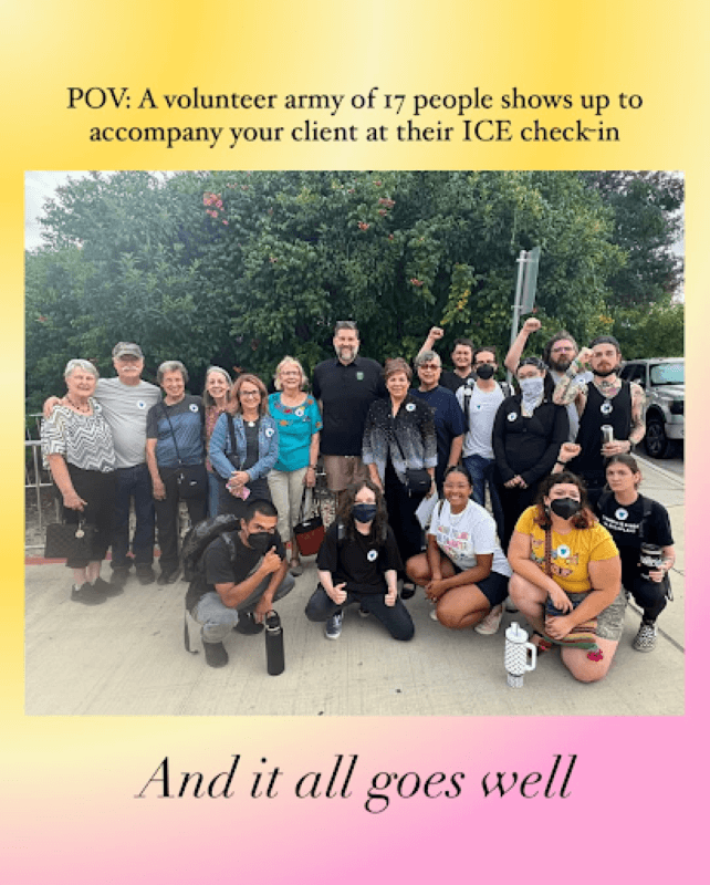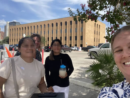 K.’s attorney shared this photo of everyone who showed up to support K. Ann reached out to IWC because she was bringing her friend K. from Austin to an ICE…
