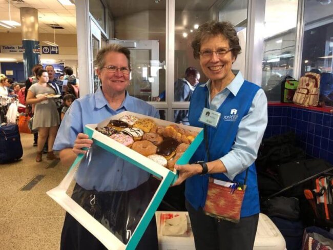 Sr. Denise LaRock and Sr. Jean Durel offer a favorite treat to asylum-seeking families at the Greyhound station. IWC began in 2014 and functioned as an all-volunteer organization for six…