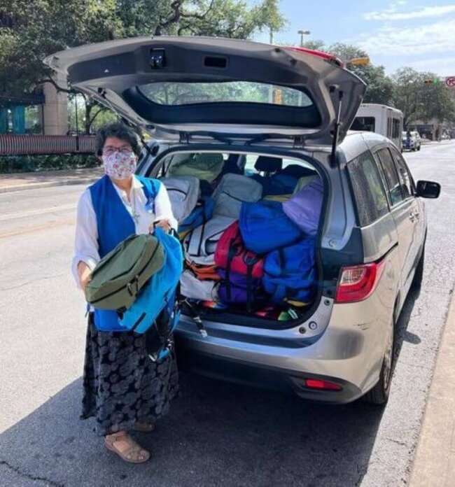 Sister Mercedes brought IWC about 100 backpacks one morning. Each one has a blanket, a bag of toiletries, and a notebook/pen — all travel necessities! Often times our asylum-seeking friends…
